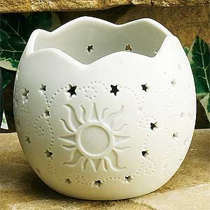 - Ball shape white semi-translucent porcelain tea light holder with semi-translucent celestial design. Wavy cut-out top opening.